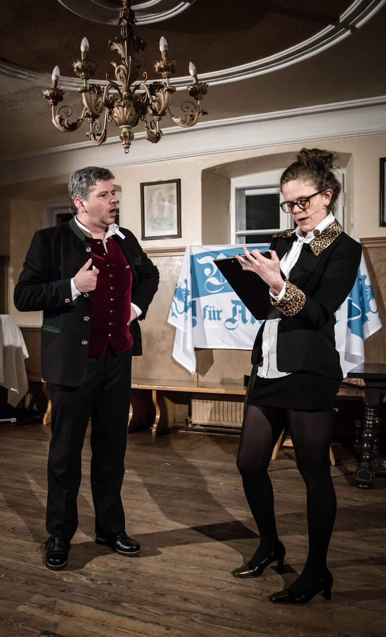 Rudi Gall und Sophie Meinecke überzeugen mit starkem komödiantischem Talent und ziehen das Publikum mit schnellen Wortgefechten und lebendiger Situationskomik in ihren Bann. Rudi Gall, echter Oberbayer aus dem Voralpenland, lebt und liebt den bayerischen Dialekt und das regionale Brauchtum. Die Deutsch-Französin Sophie Meinecke spielt seit 2010 Theater, ausgebildet an der Neuen Münchner Schauspielschule, und ist regelmäßig auf Münchner Bühnen zu sehen.